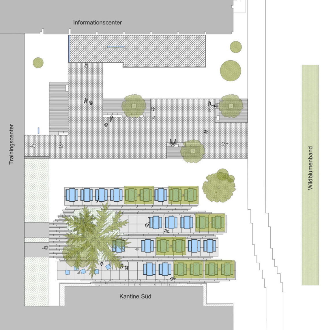 Der Platz fungiert als Vermittler zwischen den Bereichen der Außengastronomie der Kantine Süd, dem Eingang des Infocenters und dem Eingang des Trainingscenters.