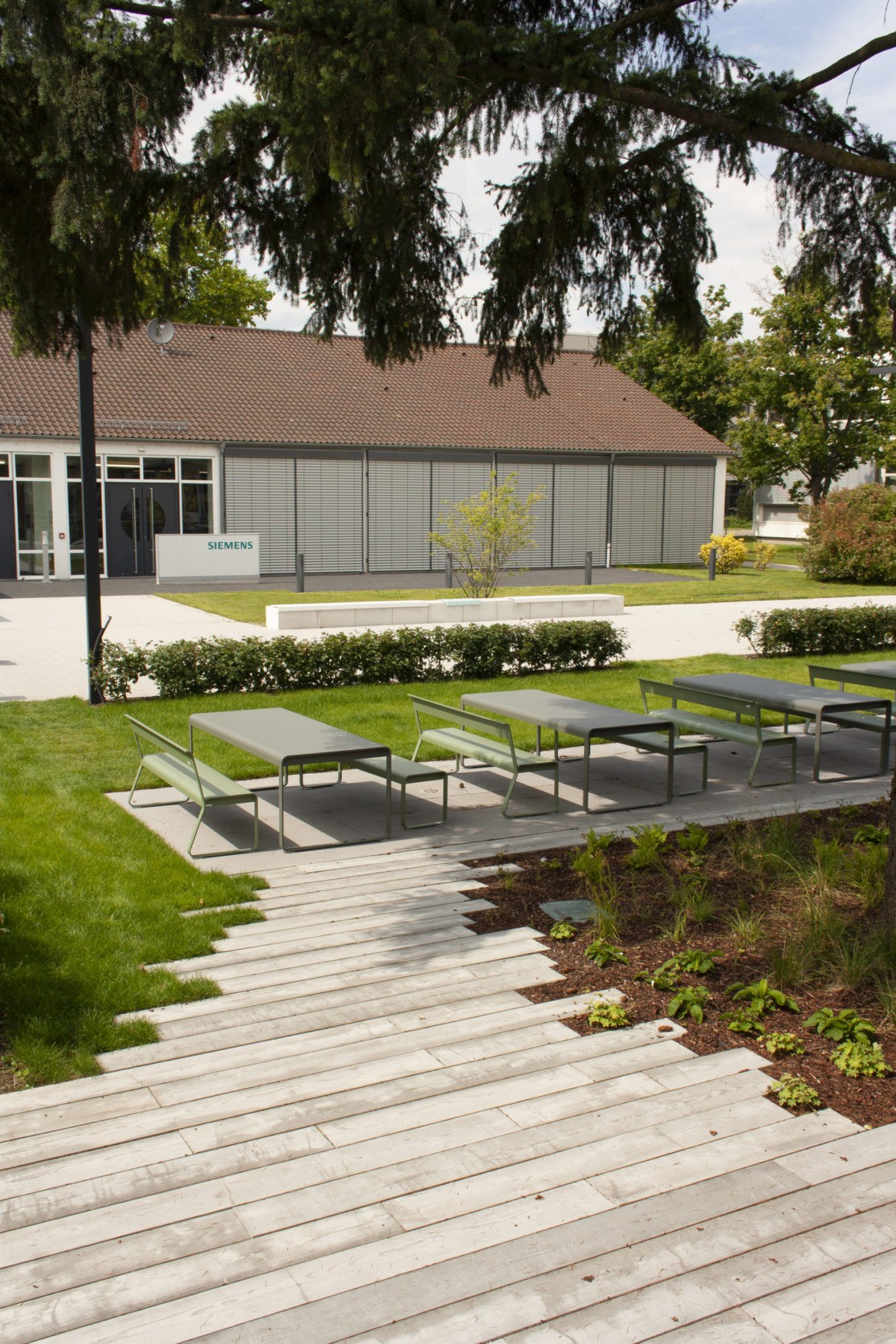 Im Zuge der Einrichtung eines neuen Informations- und Trainingscenters auf dem Siemens-Campus Karlsruhe haben sich die Anforderungen an den Außenraum geändert. Zwischen Kantine Süd und Informations- und Trainingscenter wurde die Fläche neu definiert.