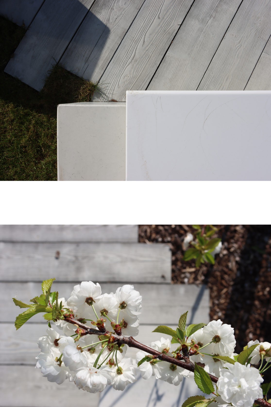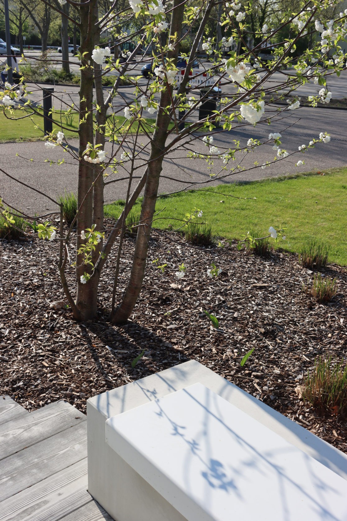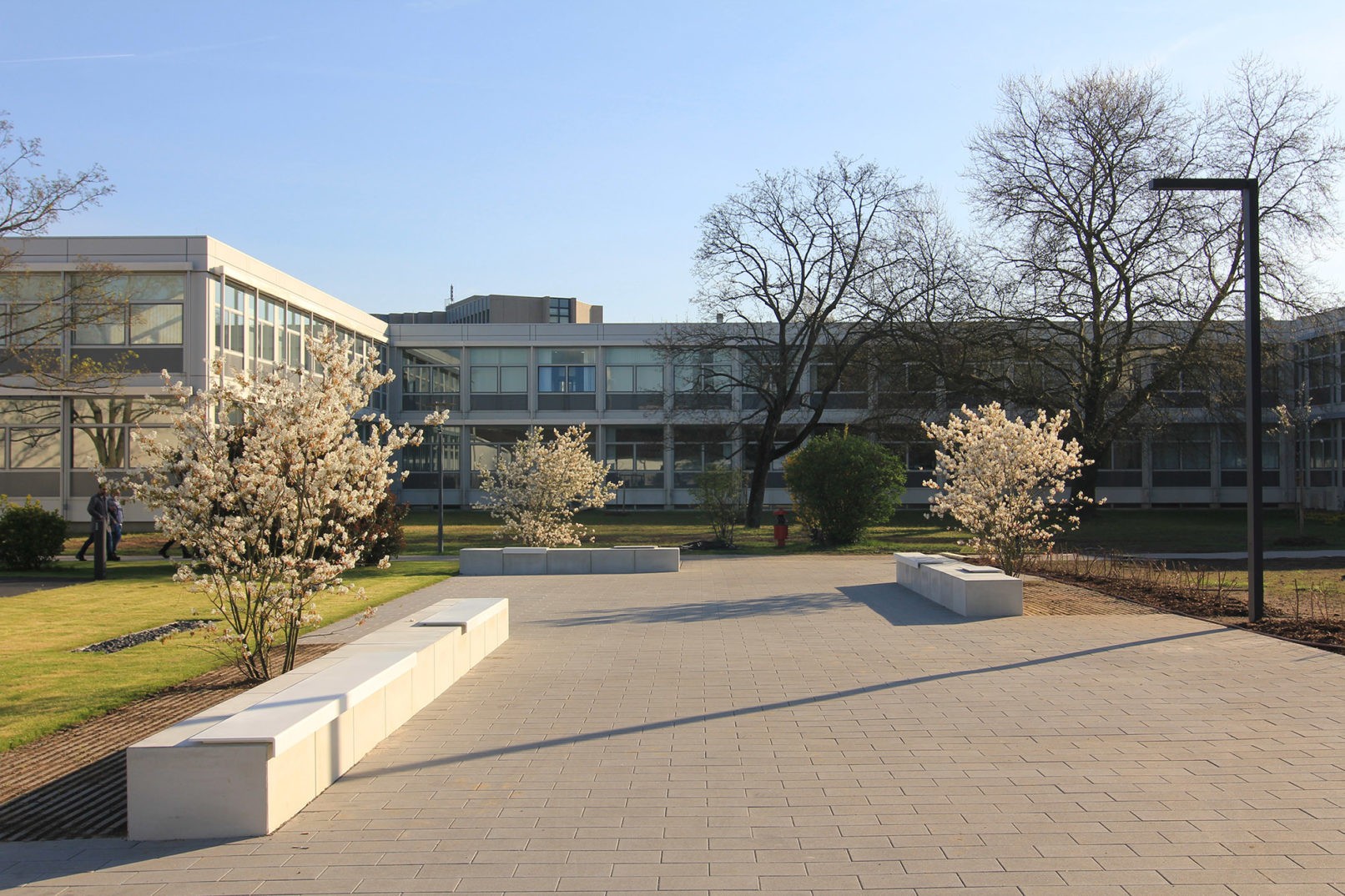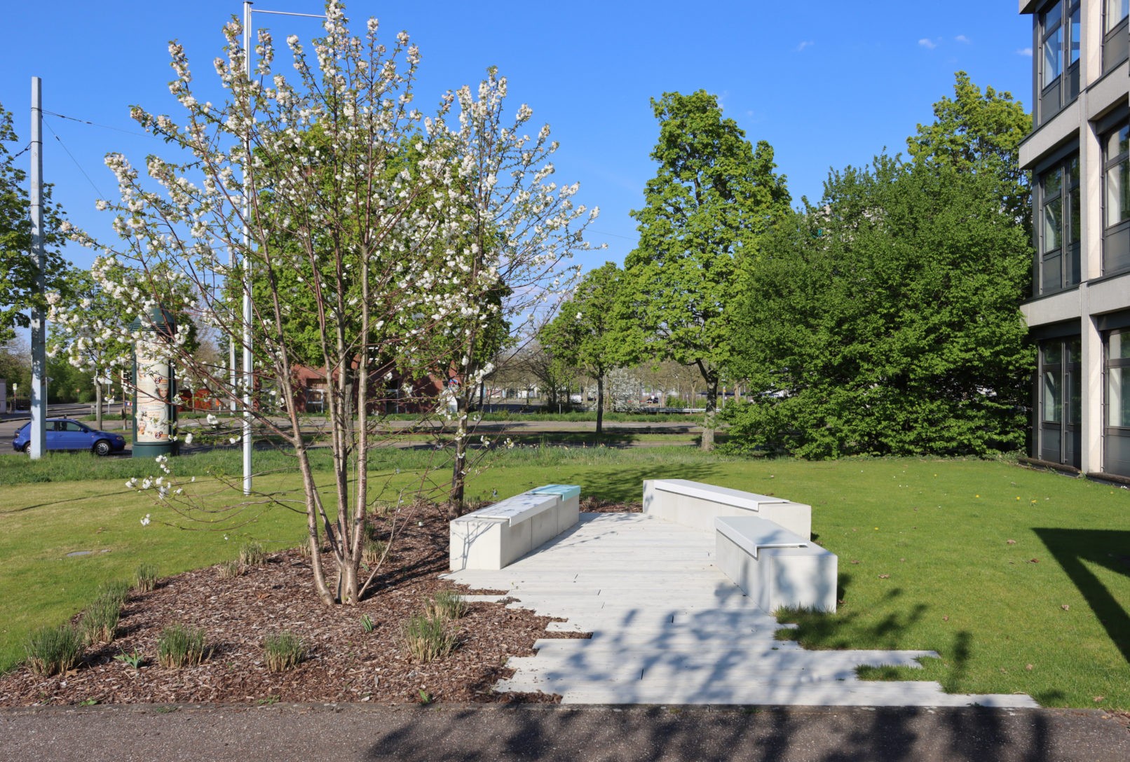 Kombinationen aus Sitzelementen, strukturierten, linearen Rasenfeldern und der Pflanzung von Felsenbirnen bilden dabei die räumliche Strukturierung mit Aufenthaltsqualität.