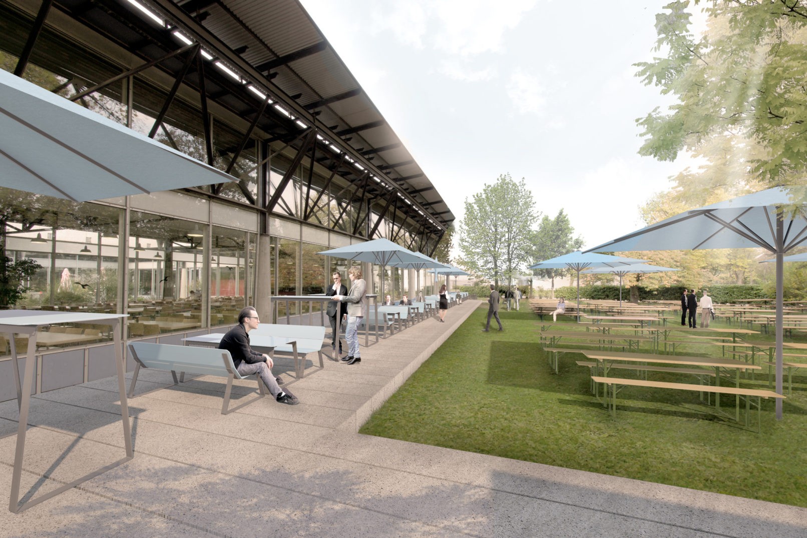 Der Außengastronomiebereich gliedert sich neu und erhält eine ganzjährig nutzbare befestigte Terrasse. Die bestehende Event-Außenküche wird in diese Fläche eingebunden.