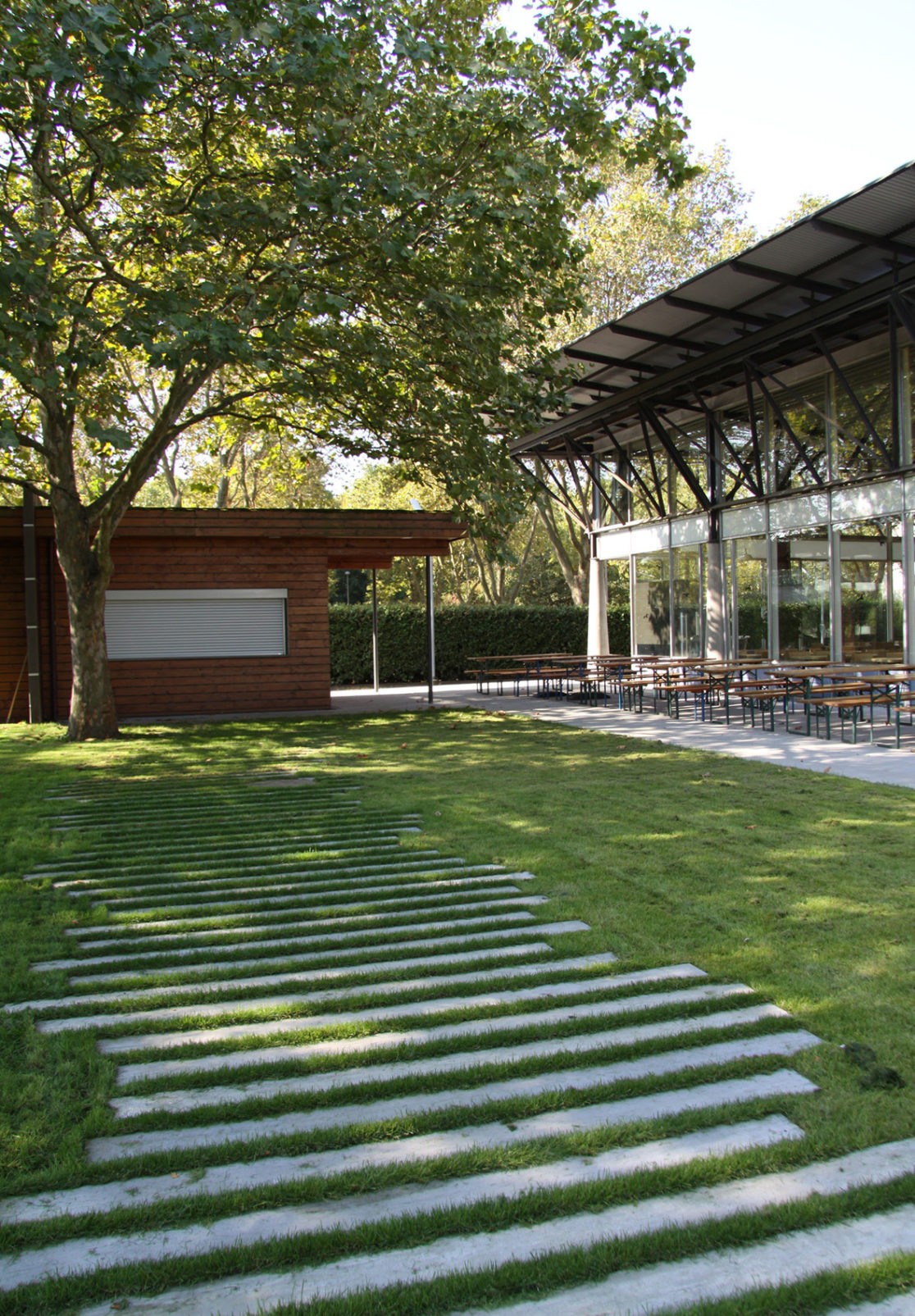 Für die sommerliche Nutzung steht die Rasenfläche zur Verfügung. Um einen komfortablen und für den Rasen schonenden Zugang zu ermöglichen wurden in der Fläche Trittschwellen verlegt.
