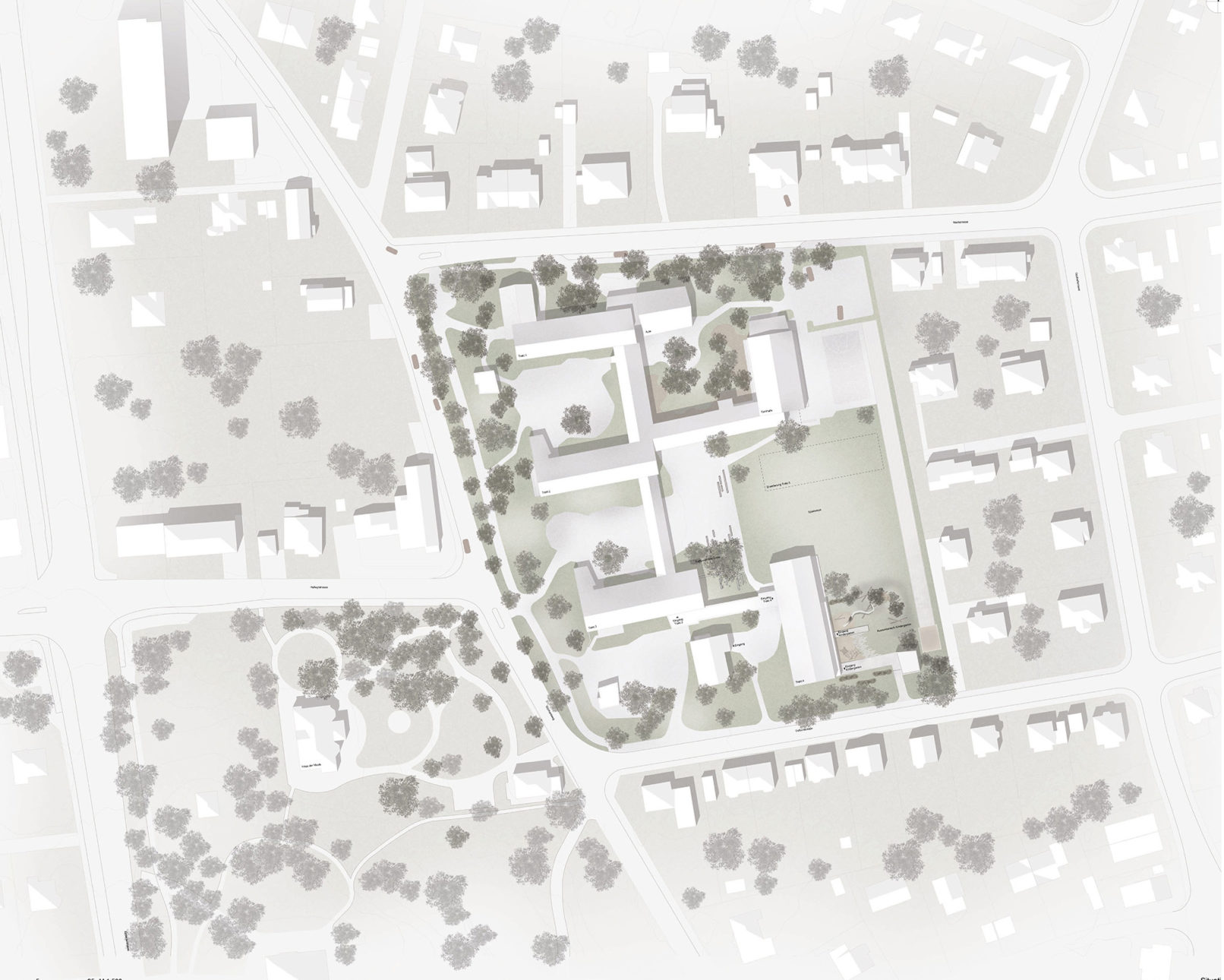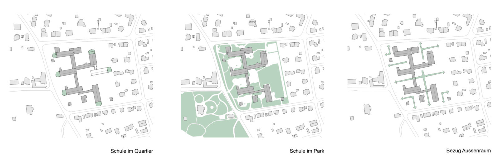 Die Idee der neuen Aussenraumgestaltung ist es die bestehenden Qualitäten des Außenraumes in ihrer räumlichen Ordnung aufzugreifen, diese zu verstärken und zu ergänzen. Ziel ist es einen identitätsstiftenden Freiraum zu gestalten, welcher die vorhandenen baulichen Strukturen von Schulanlage und Wohnquartier zu verknüpfen weiss. Der parkartige, offene Charakter des Außenraumes mit den alten Bestandbäumen auf dem Gelände, sowohl als auch in der Umgebung, bildet hierbei die Referenz für weitere Entwicklungen im Freiraum, während die Bestandsbauten mit ihren Erweiterungen das räumliche Gerüst für den Außenraum vorgeben.