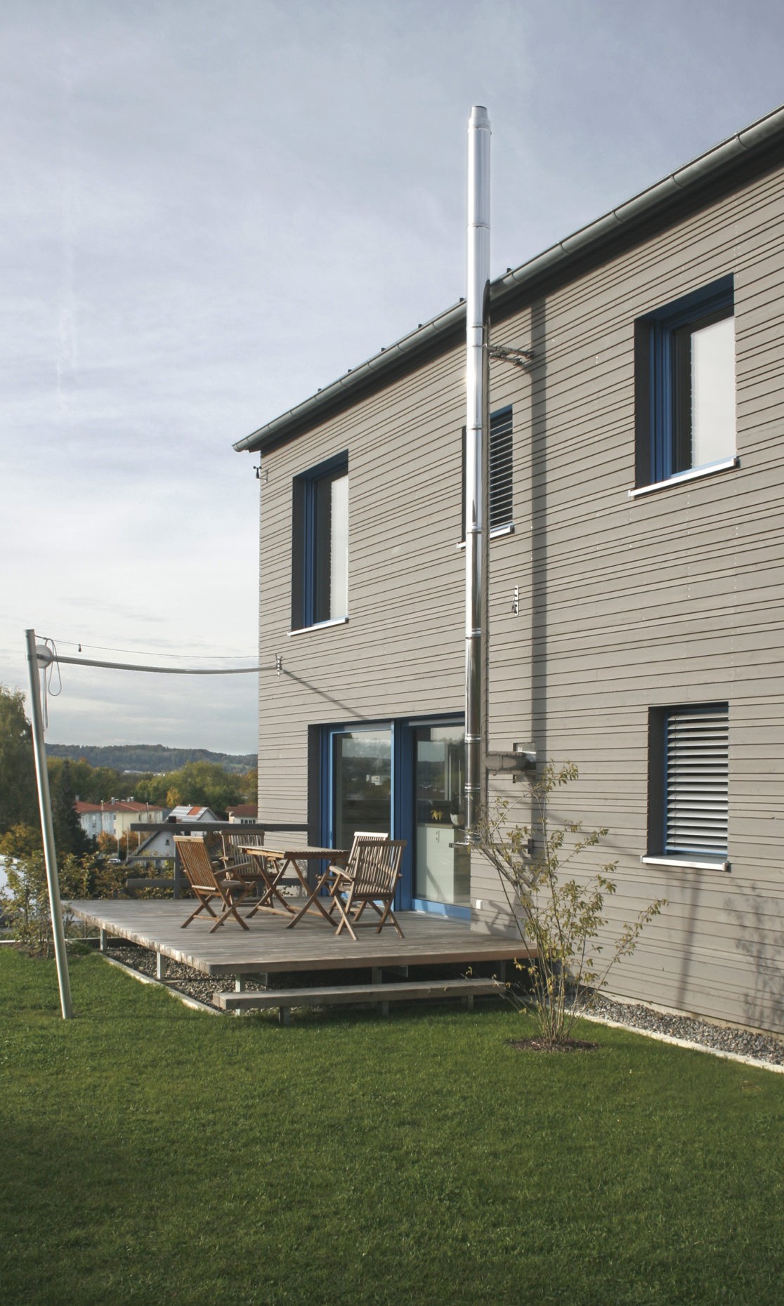 Diese kompakte Bauweise nutzt den umbauten Raum wirtschaftlich und reduziert die Wärmeverluste der Gebäudehülle. Das Gebäude entspricht dem KfW 55 Standard.