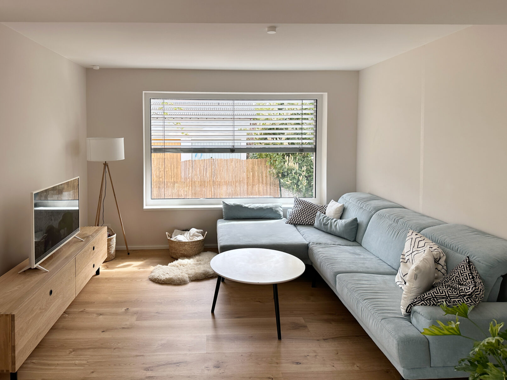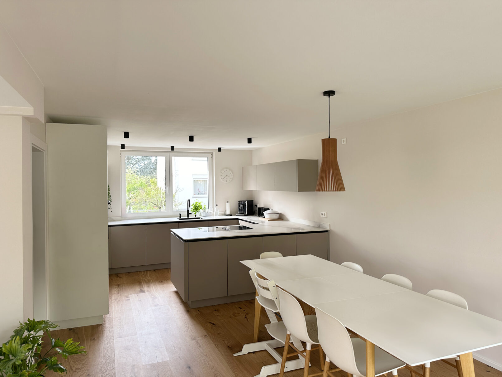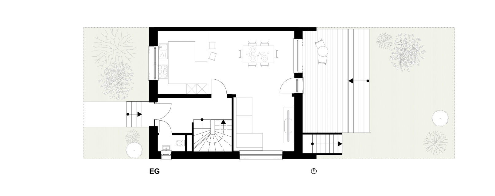 Im Erdgeschoss entsteht ein offener und heller Grundriss. Das wird durch das Öffnen von Innenwänden und das Schaffen von Blickachsen erreicht. Teilweise werden die Fensteröffnungen erweitert und ein neues Sitzfenster montiert. Zusätzlich schaffen bodentiefe Fenster zur Gartenseite eine nahtlose Verbindung zwischen Wohn- und Außenraum. Insgesamt entsteht im Erdgeschoss eine helle großzügige Fläche auf einem eigentlich kompakten Grundriss.