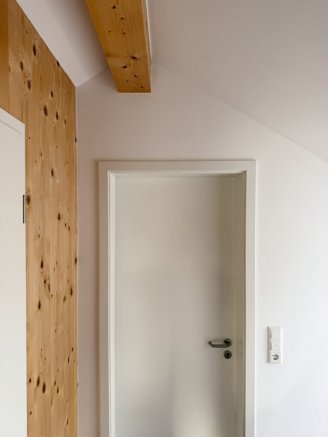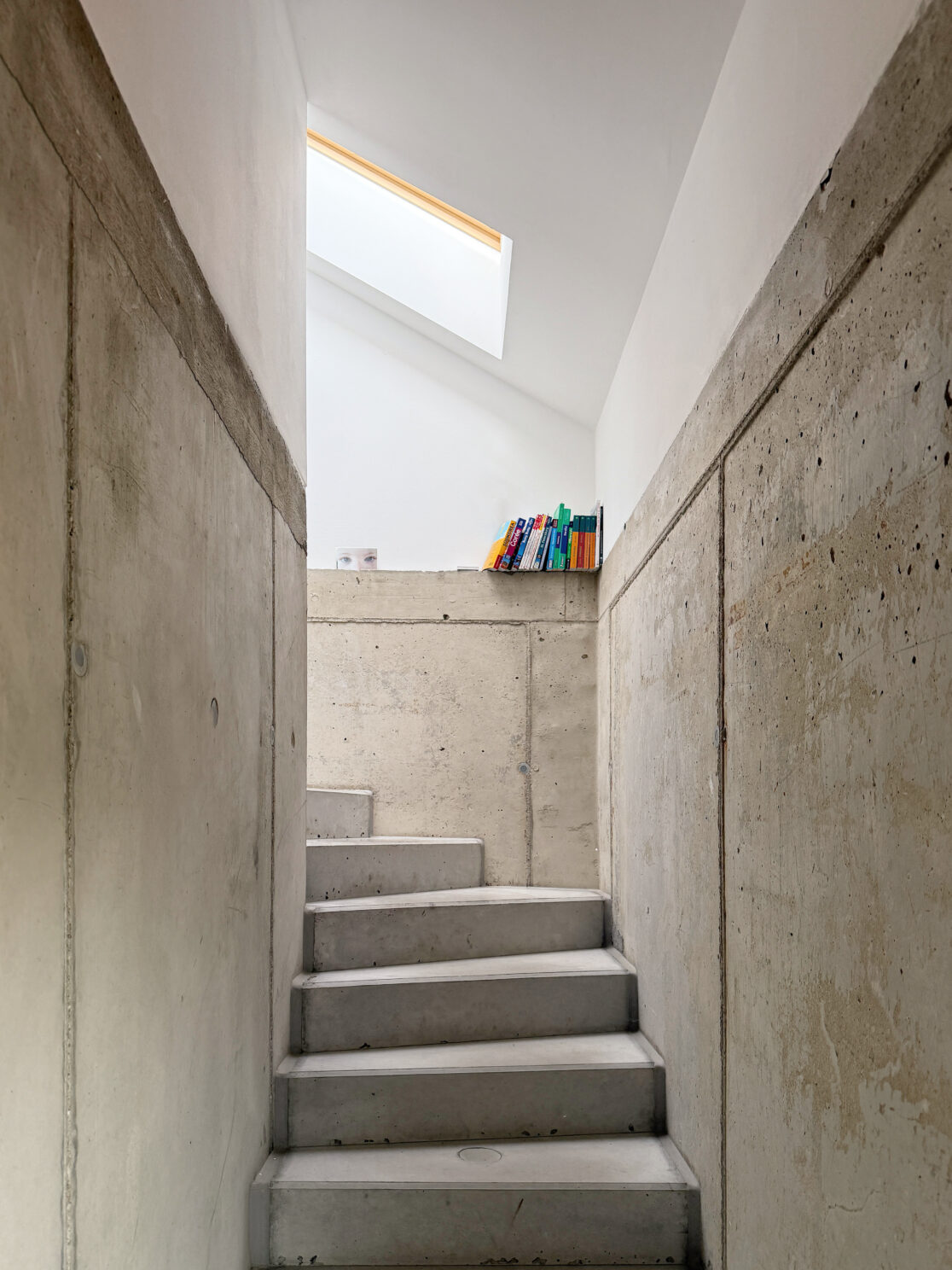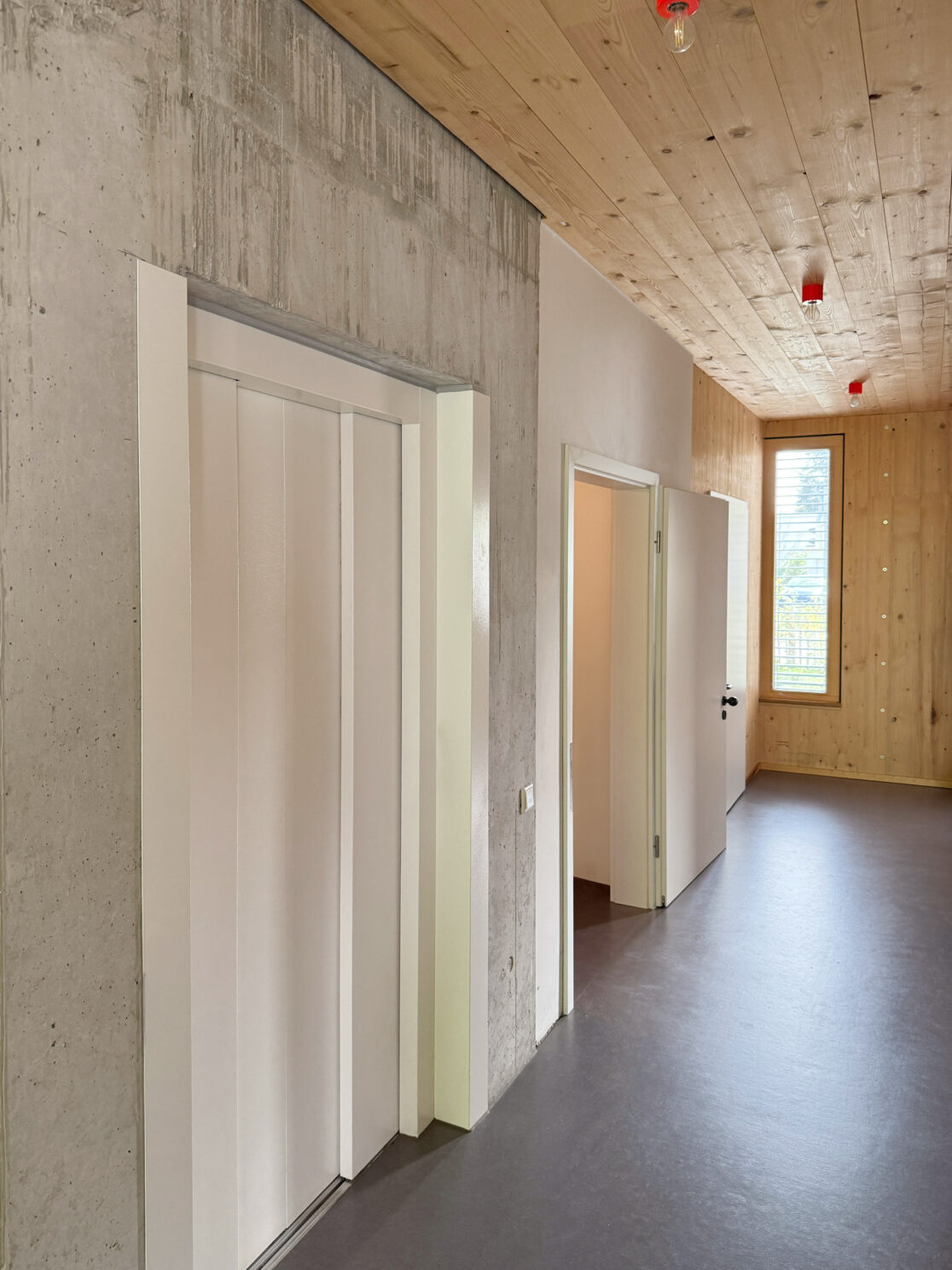 Beim Innenausbau setzt der Entwurf auf die Ästhetik roher und naturbelassener Oberflächen. Im Treppenkern prägt das Relief des schalungsrauen Sichtbetons die materielle Erscheinung. In den Wohnräumen werden in vielen Bereichen die rohen Brettsperrholzplatten offen gelassen und damit gezielt als Gestaltungselement eingesetzt. Darüber hinaus wird durch dieses Konzept der Bauherrenschaft eine gewissen Flexibilität und Gestaltungsfreiheit im Umgang mit den rohen Oberflächen überlassen, was eine höhere Identifikation der Bewohner mit dem Wohnobjekt ermöglicht. Sollte es erwünscht sein, können alle Oberflächen mit geringem Aufwand zu einem späteren Zeitpunkt „klassich“ verkleidet und gestrichen werden.