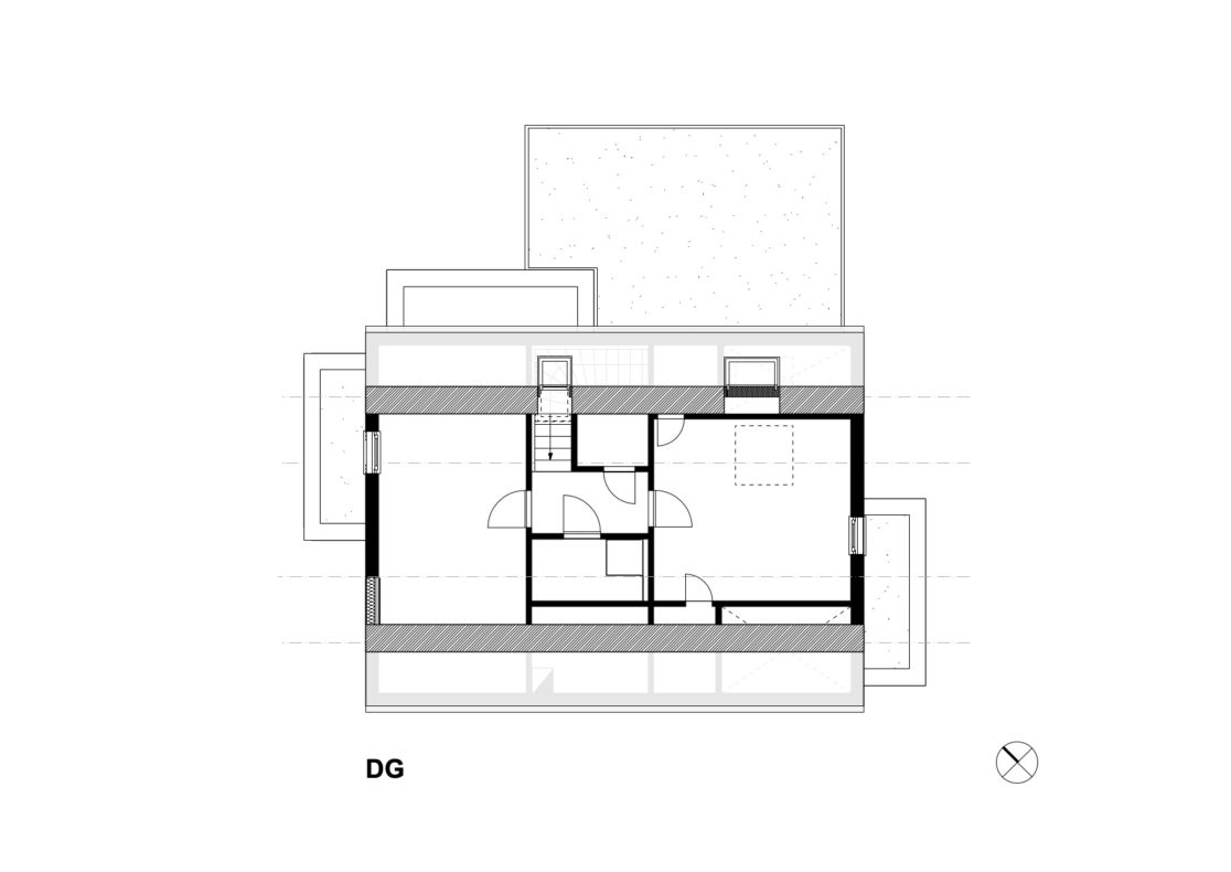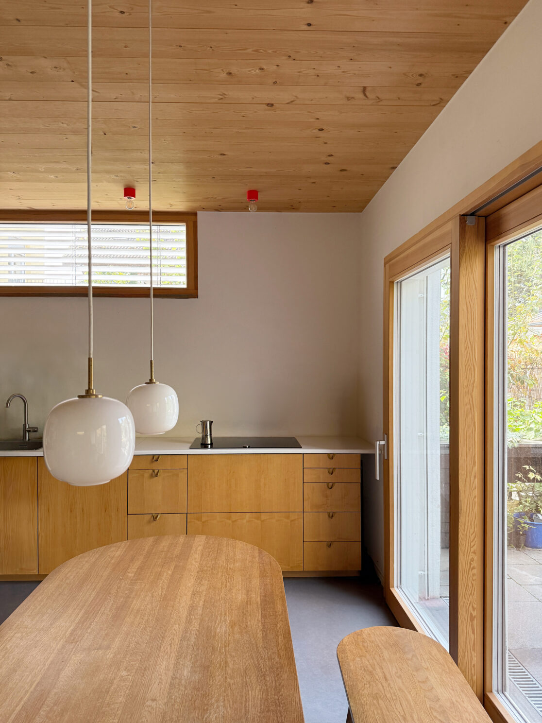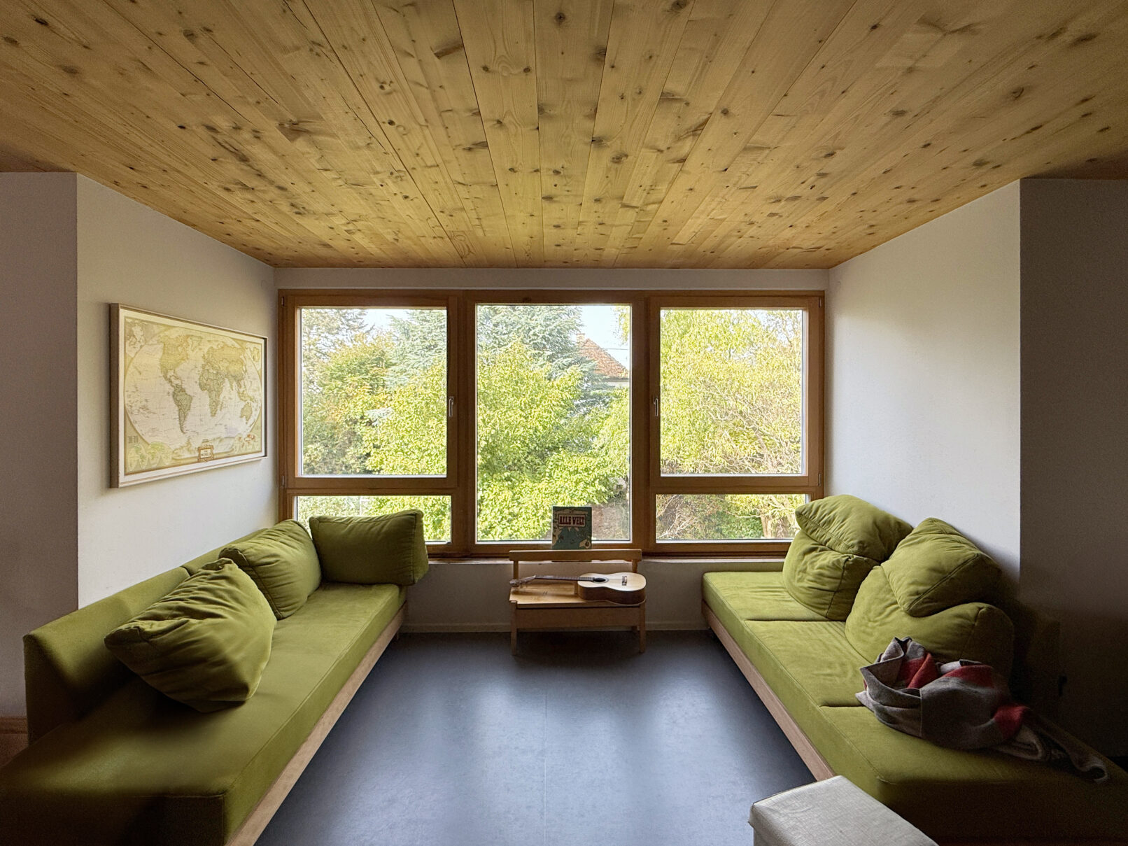 Beim Innenausbau setzt der Entwurf auf die Ästhetik roher und naturbelassener Oberflächen. Im Treppenkern prägt das Relief des schalungsrauen Sichtbetons die materielle Erscheinung. In den Wohnräumen werden in vielen Bereichen die rohen Brettsperrholzplatten offen gelassen und damit gezielt als Gestaltungselement eingesetzt. Darüber hinaus wird durch dieses Konzept der Bauherrenschaft eine gewissen Flexibilität und Gestaltungsfreiheit im Umgang mit den rohen Oberflächen überlassen, was eine höhere Identifikation der Bewohner mit dem Wohnobjekt ermöglicht. Sollte es erwünscht sein, können alle Oberflächen mit geringem Aufwand zu einem späteren Zeitpunkt „klassich“ verkleidet und gestrichen werden.