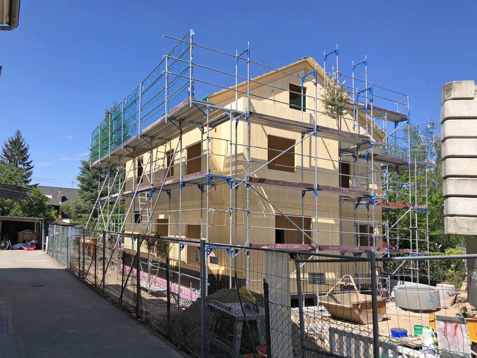 Das dreigeschossige Gebäude wird in Holzhybridbauweise konstruiert. Aussteifende Elemente und der Schacht für den Aufzug, der den barrierefreien Zugang aller Geschosse bis auf das Dachgeschoss sicherstellt, werden in Stahlbeton konstruiert. Tragende Innenwände und die Außenwand sind in Holzmassivbauweise ausgebildet. Auch wenn diese Konstruktion eine höhere Investition in der Bauphase erfordert, begünstigt sie durch das natürliche Material Holz das Wohnklima und ermöglicht durch den schlanken Wandaufbau bei gleichen Außenmaßen eine höhere Gesamtwohnfläche.
