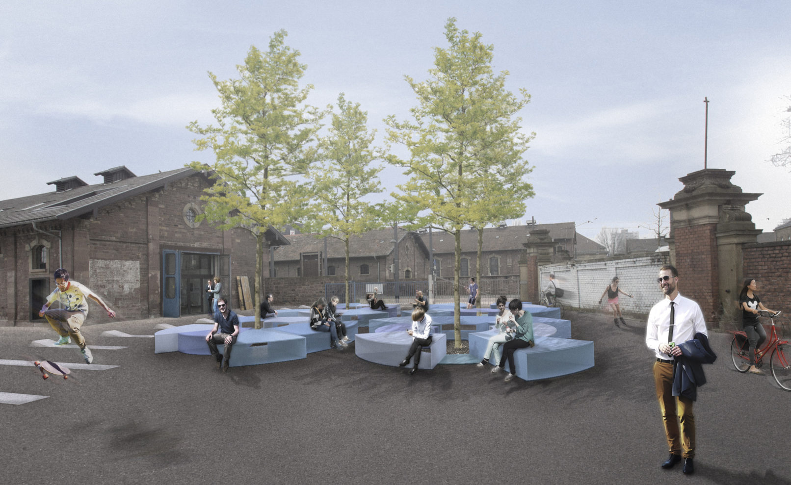 Durch die flächige Entwicklung der Außenräume sind keine klassischen Platzsituationen mit Raumkanten vorhanden. Das Projekt sieht eine Markierung der öffentlichen Aufenthaltsbereiche durch Kommunikationsinseln vor. Diese Bereiche befinden sich bei einzelnen Baumpaketen auf dem Areal. Zusammen mit einer Kombination aus Sitz- und Liegeelement schaffen sie eine räumliche Aufenthaltsqualität.
