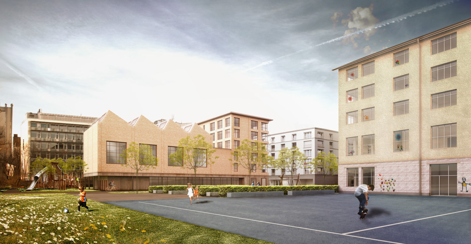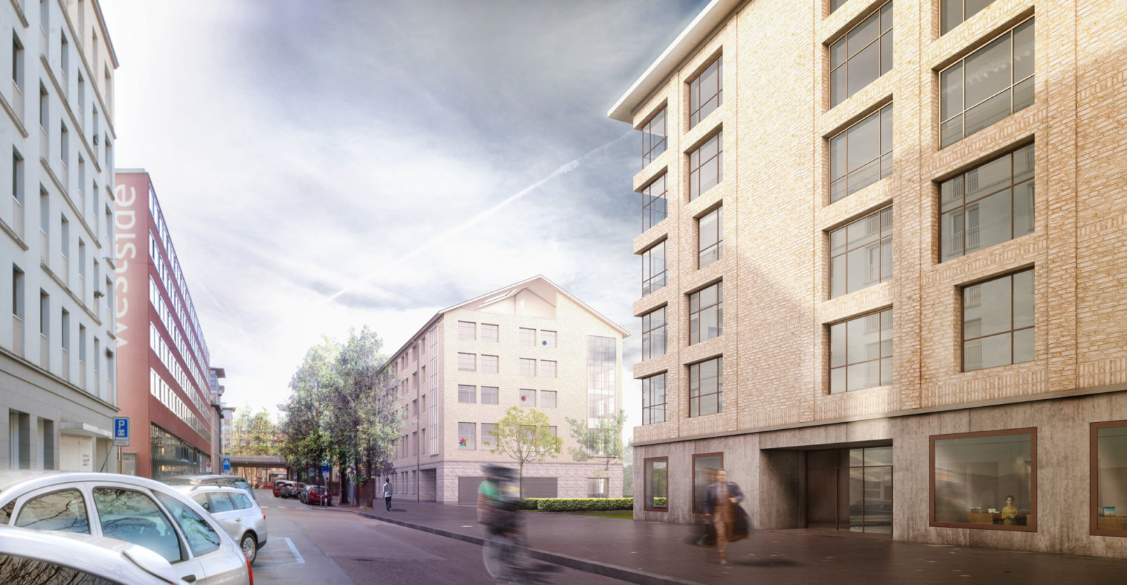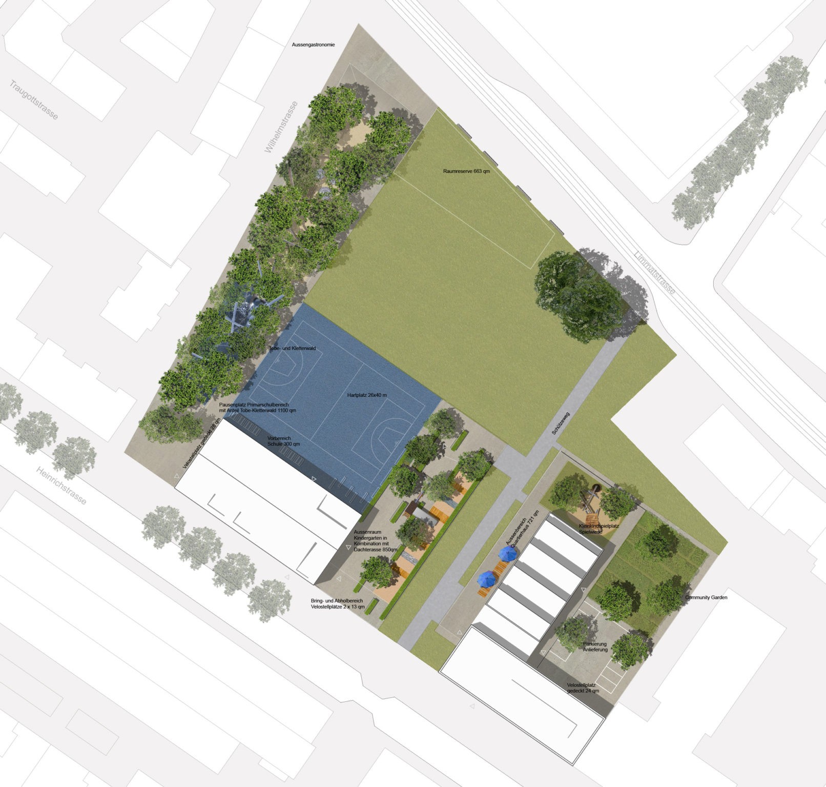 Dicht, kompakt und urban ist die Prämisse für die Transformation des Schütze-Areals. Ein haushälterischer Umgang mit Land spielt dabei eine ebenso wichtige Rolle wie eine städtebauliche Setzung in einer heterogenen urbanen Umgebung. Ein neuer Baustein aus Pestalozzi-Bibliothek, Quartierhaus und Turnhalle ergänzt die bestehende Bebauung an der Heinrichstrasse und entlang des Schützewegs. Die Nutzungen kommunizieren über die Erdgeschosse mit dem Strassenraum und den Freiräumen, zeigen ihre Nutzung nach aussen und laden die Menschen ein. Die Massstäblichkeit orientiert sich an der ehemaligen industriellen Nutzung, welche auch die neuen Gebäude in der Umgebung aufgenommen haben. Das Schulhaus Heinrich wird den neuen Anforderungen entsprechend umgebaut und um die Kindergartenklassen durch einen kompakten Baukörper zeitgemäss ergänzt. Auch hier wird besonderer Wert auf die Erdgeschosszone gelegt durch eine neue einladende Eingangssituation an der Heinrichstrasse und grossformatige Öffnungen zu den Freibereichen. Die hohe Nutzungsdichte und -intensität sowie die attraktiven Freiflächen machen das Schütze-Areal zu einem urbanen Ort und zentralen Baustein des Quartiers. Die strassenbegleitende Bebauung reagiert dazu auf die urbane Lage, die Architektur auf die industrielle Geschichte des Ortes und die Umgebung.
