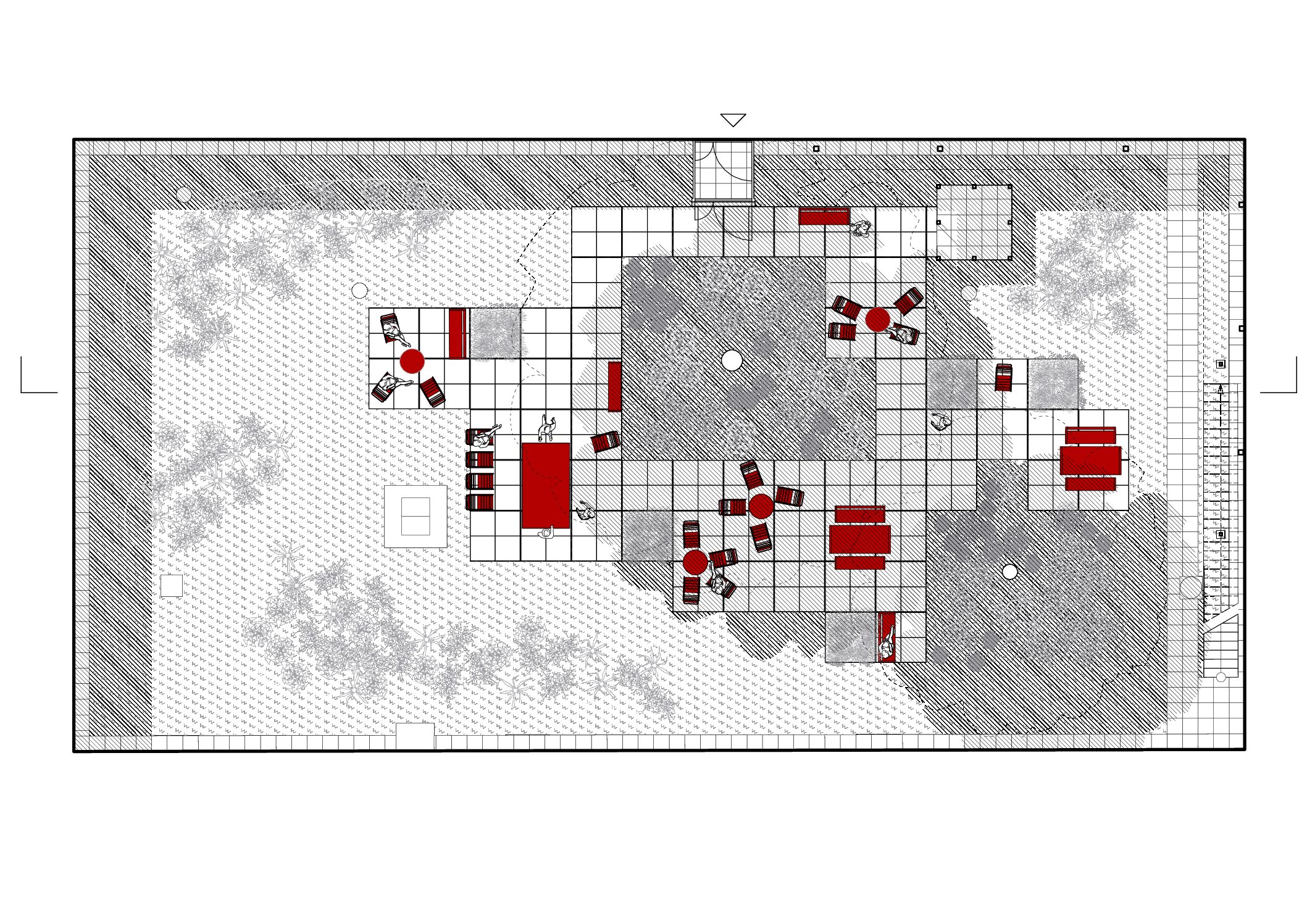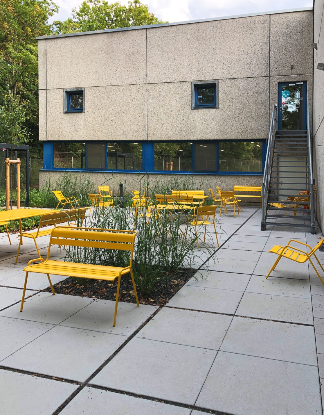 Für die Gestaltung der Freiflächen wird ein Modulsystem in einem Raster aus großformatigen Werksteinplatten mit unterschiedlich breiten Zwischenräumen und einer flexiblen Möblierung entwickelt. Die flexible Möblierung lässt den Nutzer*innen Spielräume für die tägliche Verwendung. Zudem variieren sie zum einen in ihrer Bespielung für Pausenaktivitäten wie Tischtennis oder Boccia aber auch in ihrer Farbigkeit. Somit erleichtert sich die Orientierung innerhalb des Gebäudes und für jeden Pausenbereich wird eine eigene Identität geschaffen.