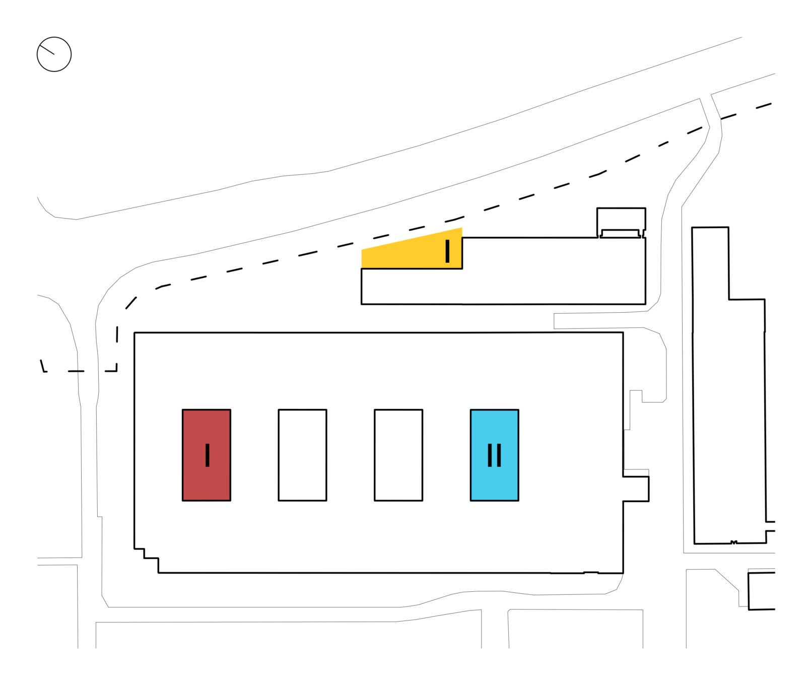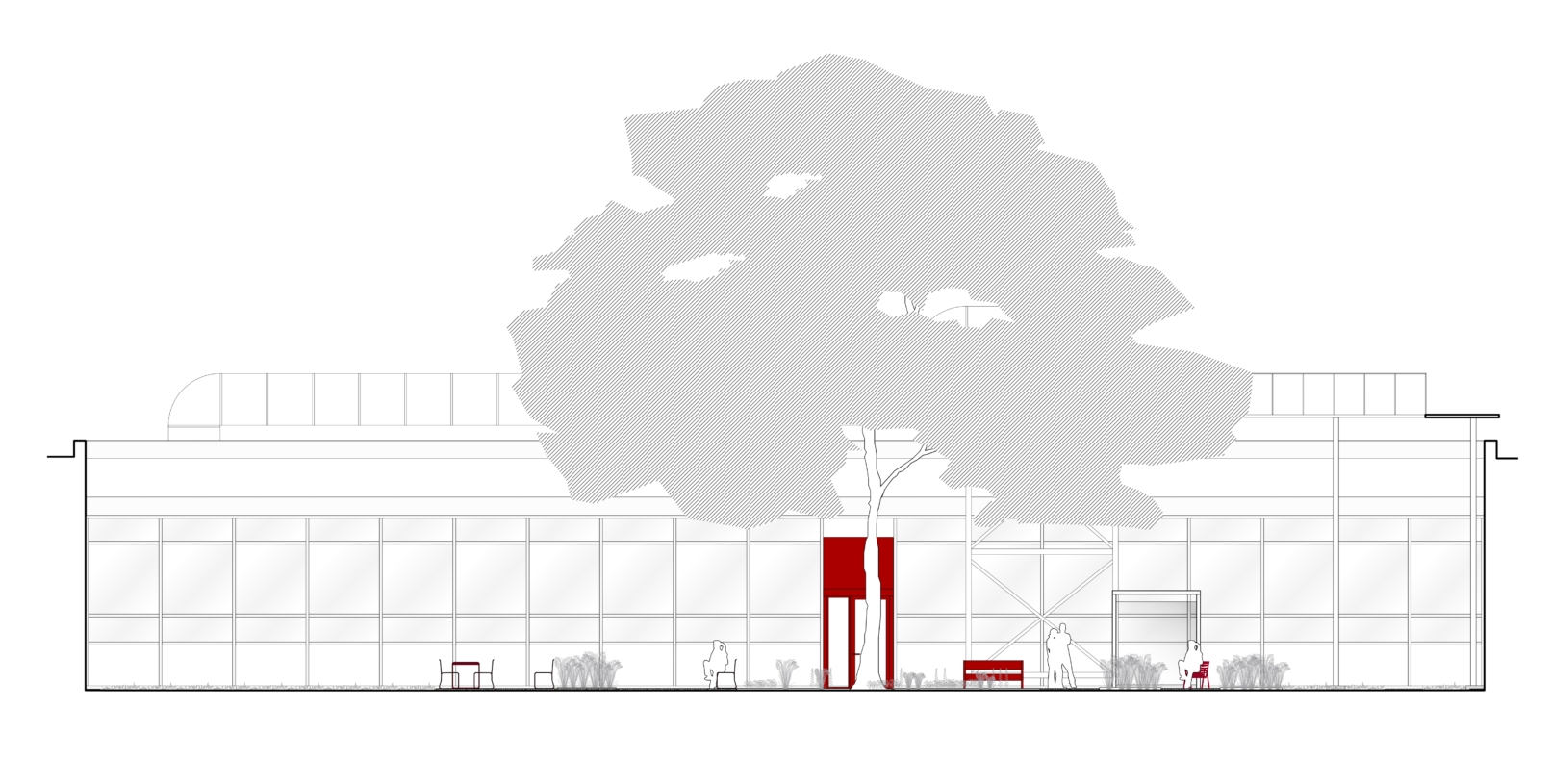 Um die Höfe als Pausenbereiche nutzbar zu machen, mussten die Zugänge an die Hohe Anforderung an Sauberkeit in den Hallen angepasst werden. Die bestehenden Ausgänge werden mit Windfängen ergänzt um den direkten Eintrag von Laub und Staub zu minimieren.