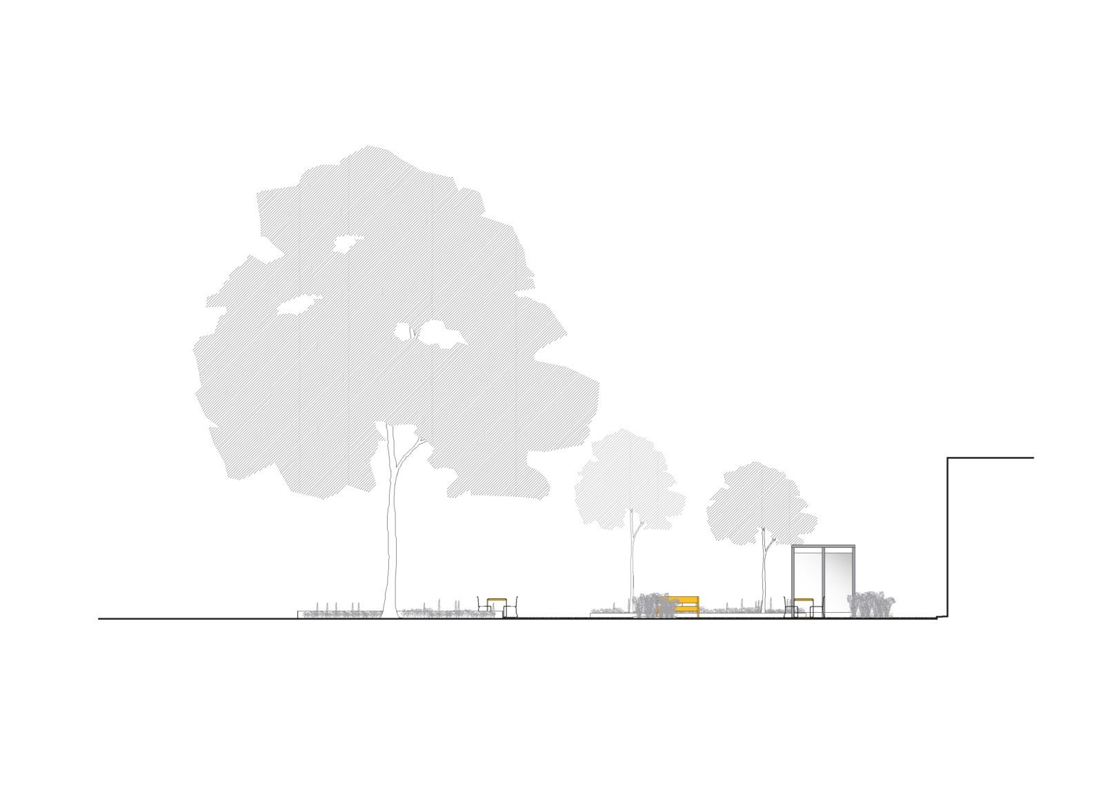 Um die Höfe nur minimal zu versiegeln, werden nur partiell Platten ausgelegt. Die großen Bestandsbäume werden als raumbildende Objekte erhalten. Die dadurch entstehenden Grünflächen werden mit pflegearmen regionalen Wildkräutern und insektenfreundlichen Blühpflanzen bepflanzt. Durch die trockenheitsresistente Bepflanzung kann auf künstliche Bewässerung verzichtet werden.