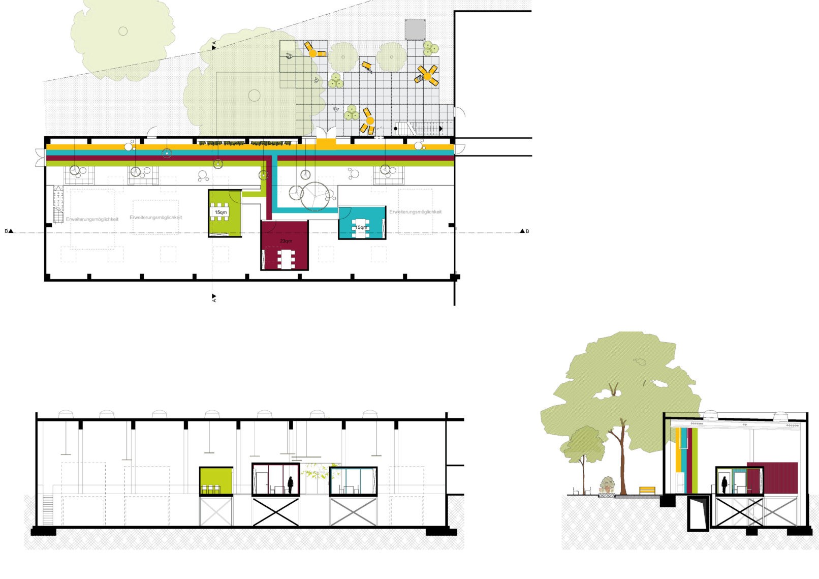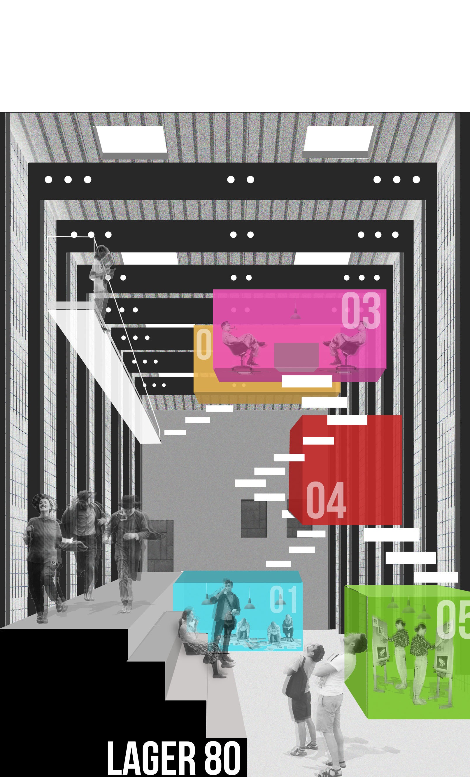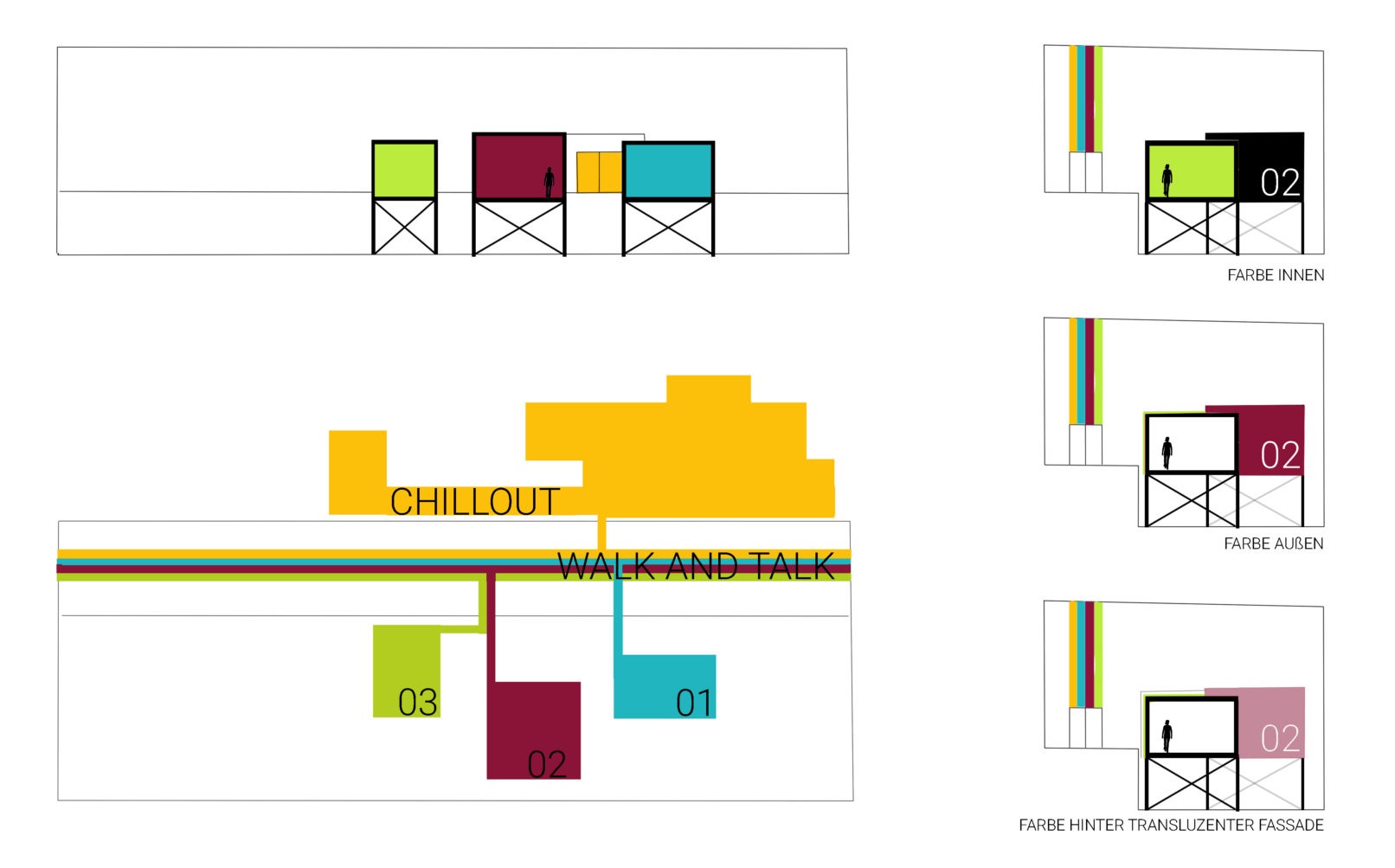Die Studie untersucht verschiedene Farbkonzepte und die volumetrische Anordnung neuer Baukörper innerhalb des Bestandsgebäudes. Es entsteht ein kreativer Workspace, der von kleineren Arbeitsgruppen des gesamten Campus genutzt werden können. Dieser Treffpunkt ist Ausdruck der modernen Arbeitswelt und den sich ändernden Anforderungen an flexible Arbeitsplätze. Dabei dient die Empore als Kommunikations- und Bewegungsraum, daran angeschlossen befinden sich unterschiedlich große Cubes, die als Besprechungs- und Gruppenarbeitsräume dienen. Dadurch entsteht innerhalb der weitläufigen Bestandshalle eine intimere Kreativitätszone.