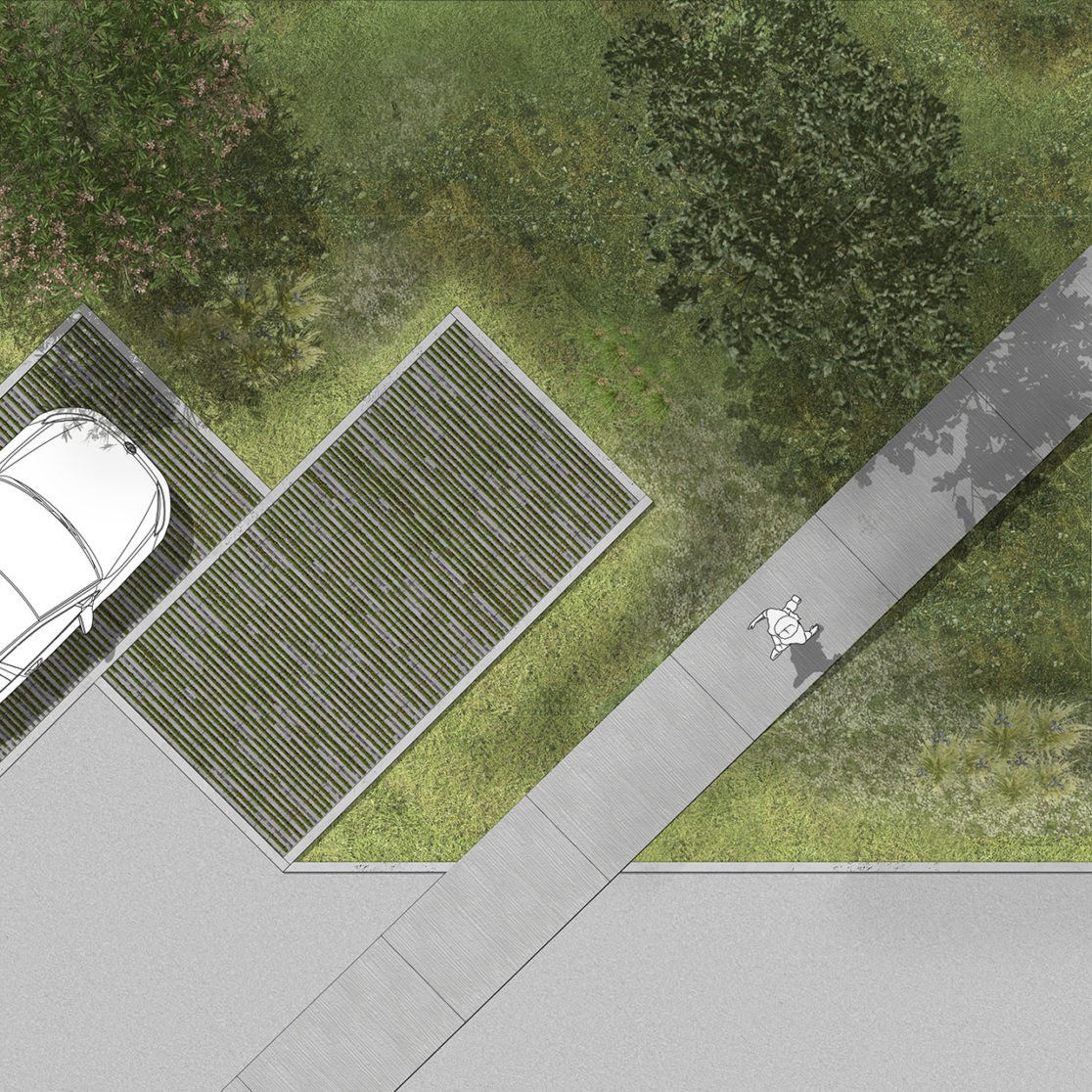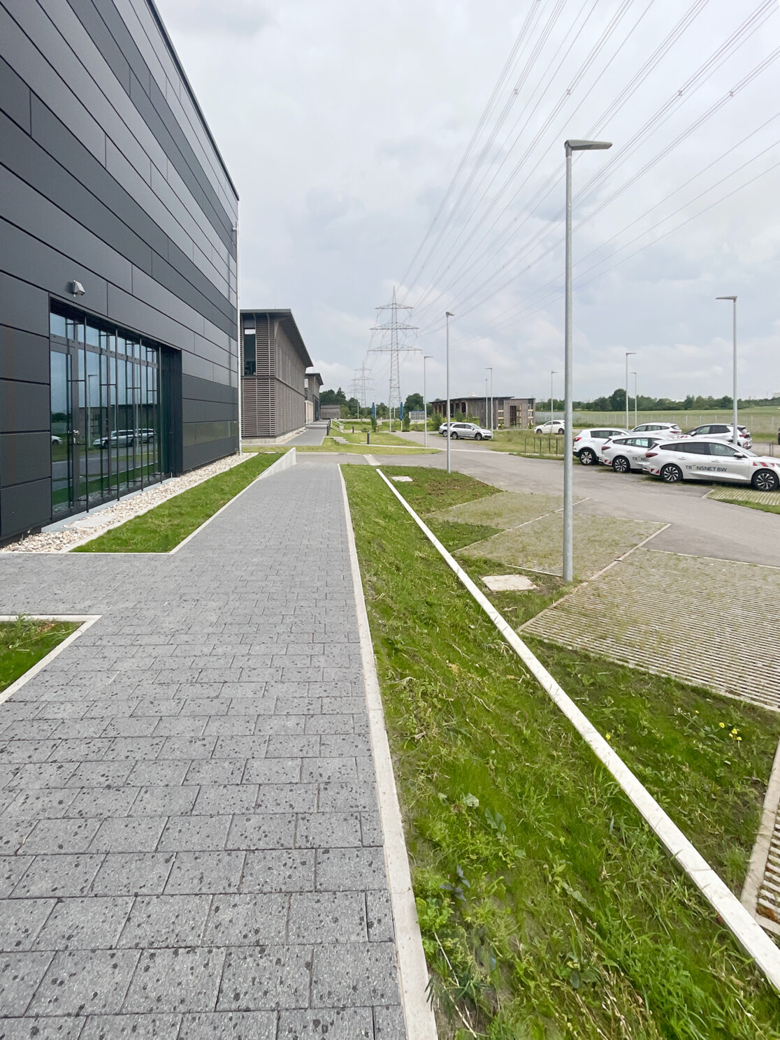 Die Fahrbuchten der Mitarbeiterparkplätze werden mit Rasengittersteinen belegt und sind somit durchlässig für Regenwasser. Durch eine leichte Absenkung der Fahrbahn in Richtung der Parkplätze und der begrünten Versickerungsmulden wird das anfallende Regenwasser vor Ort abgeleitet und direkt versickert. In den Pflasterzwischenräumen und in den Versickerungsmulden können standortangepasste Pflanzen wachsen.