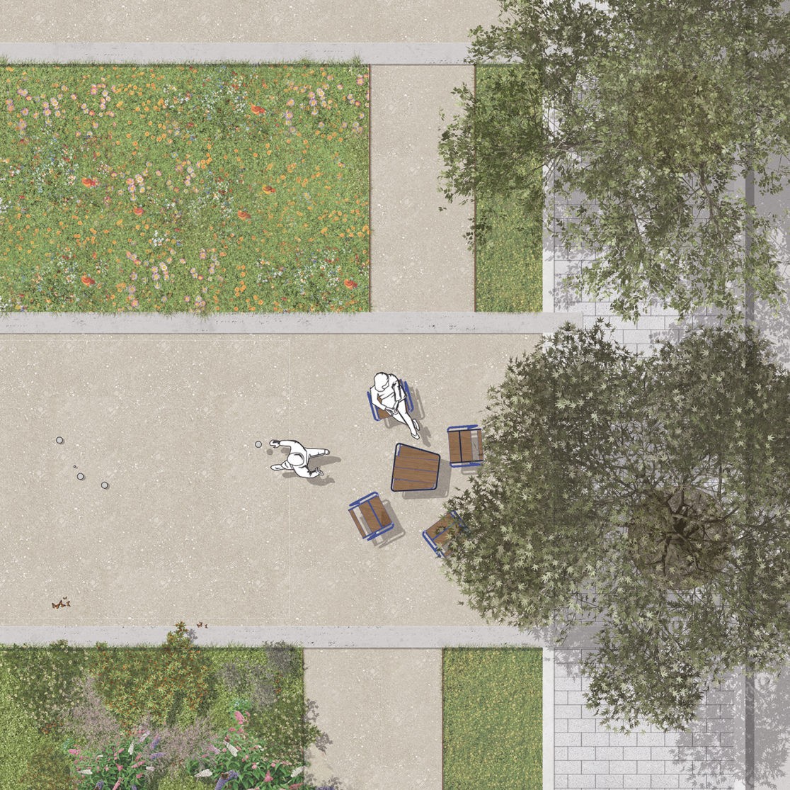 Streuobstwiesen mit hochstämmigen Obstbäumen gehören zu den am stärksten gefährdeten Biotopen Mitteleuropas. Aus diesem Grund wird der Bereich der Pausenflächen mit einheimischen Obstbäumen bepflanzt. Die Bauminseln werden durch blühende Wildblumenwiesen zusätzlich ökologisch aufgewertet.