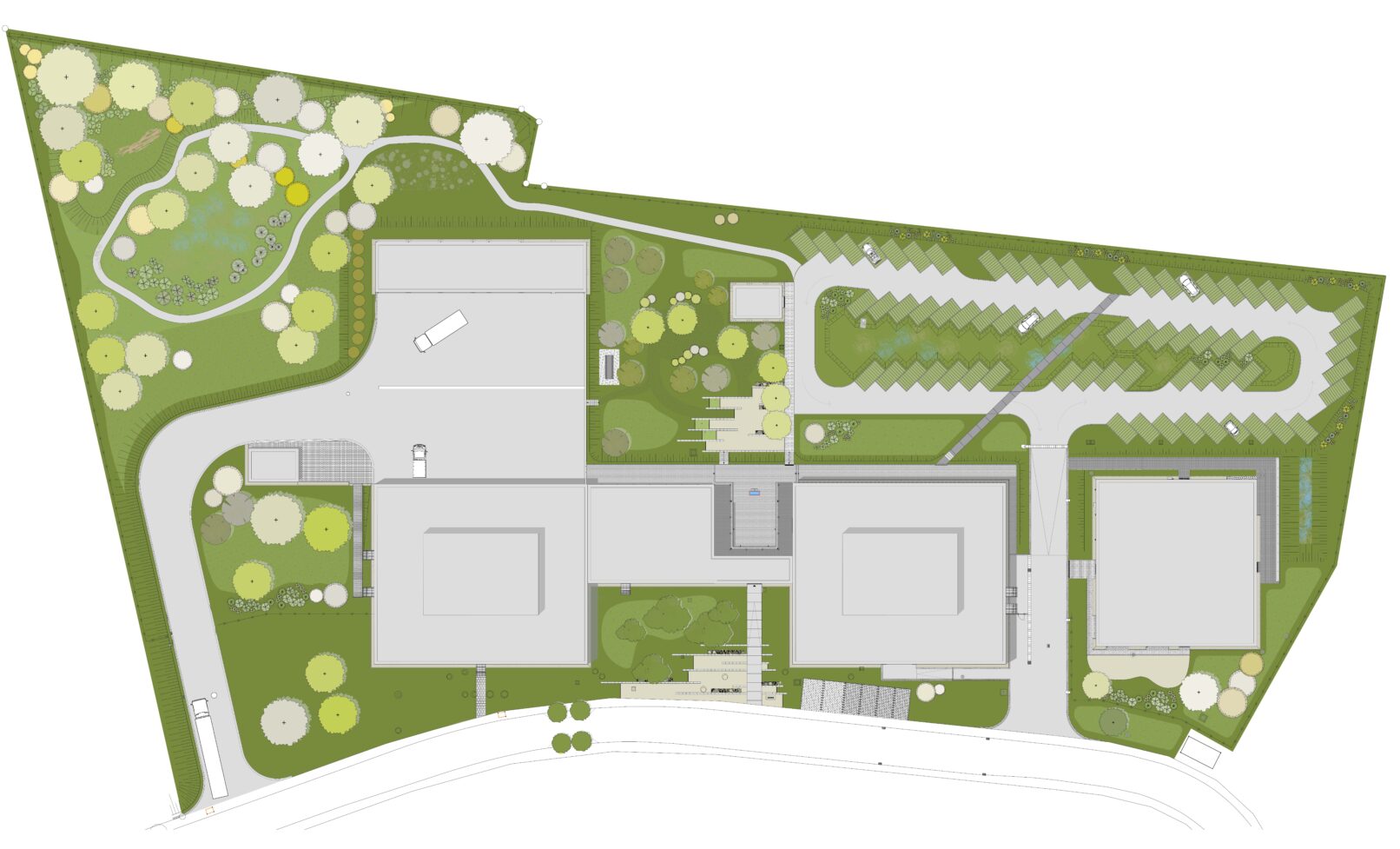 Der gesamte Gebäudekomplex wird in ein Grünkonzept eingebettet. Eine zentrale Freiraum-Achse dient als infrastrukturelle Verbindung und inszeniert den Übergang in die naturnah gestalteten Außenbereiche. Man durchläuft die gestalteten Außenräume des Eingangsbereiches, des Atriums, der Böschung, des Parks und endet in einem naturnahen Bereich, der sich wie eine Klammer um das ganze Grundstück legt.
